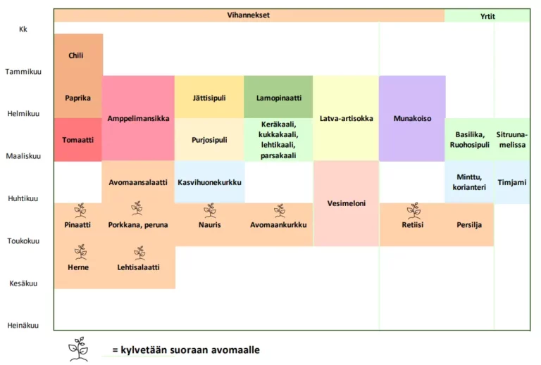 Ohessa kylvökalenterimme, josta on helppo tarkistaa milloin mitäkin vihannesta kannattaa laittaa kasvamaan!