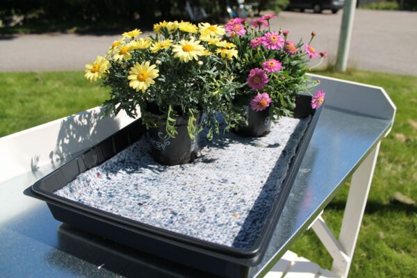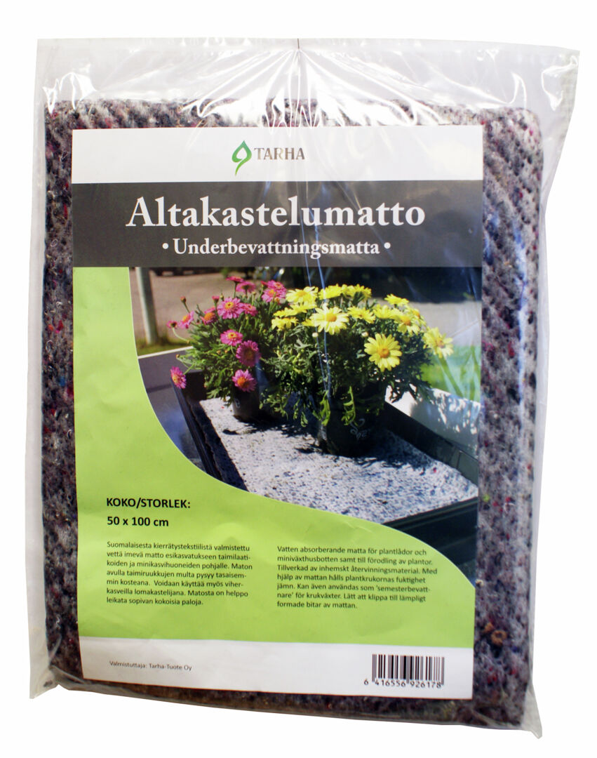 Suomalaisesta kierrätystekstiilistä valmistetun vettä imevän maton voit asettaa esim. taimilaatikoiden ja minikasvihuoneiden pohjalle, jolloin taimiruukkujen multa pysyy tasaisemmin kosteana.