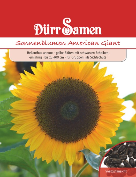 Isoauringonkukka American Giant. Voi kasvaa jopa 4 metriä korkeaksi. Keltainen kukka, musta keskus. Pussissa noin 10 siementä.