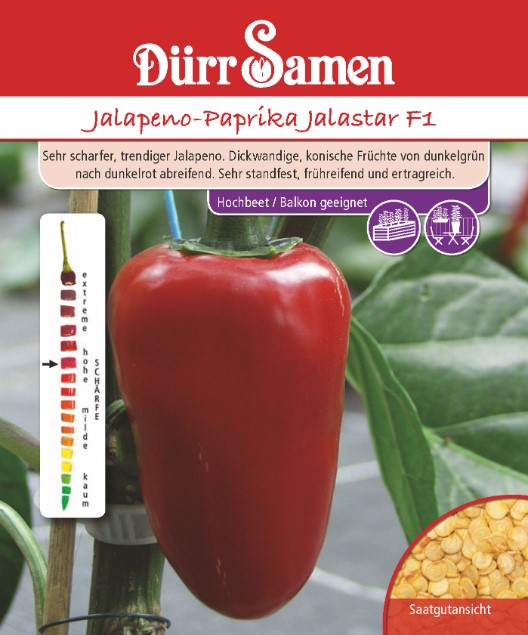 Jalapeno paprika Jalastar F1. Erittäin tulinen, trendikäs jalapeno-paprika. Paksuseinäiset, kartiomaiset hedelmät. Kypsyvät tummanvihreistä tummanpunaisiin. Varhain kypsyvä ja satoisa. Viljellään kasvihuoneessa tai ruukussa, lämpimässä paikassa esim. parvekkeella. Viihtyy ravinteikkaassa maassa. Annoksessa 6 siementä.