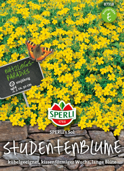 Kääpiösamettikukka Sperli’s Sol. Korkeus 25 cm. Yksinkertaiset kukat. Kylvetään maalis-toukokuussa, siemen itää 7-14 vuorokaudessa 18 asteessa. Taimiväli 25×25 cm. Kukinta heinä-lokakuussa. Viihtyy aurinkoisella kasvupaikalla. Annoksesta tulee noin 30 tainta.