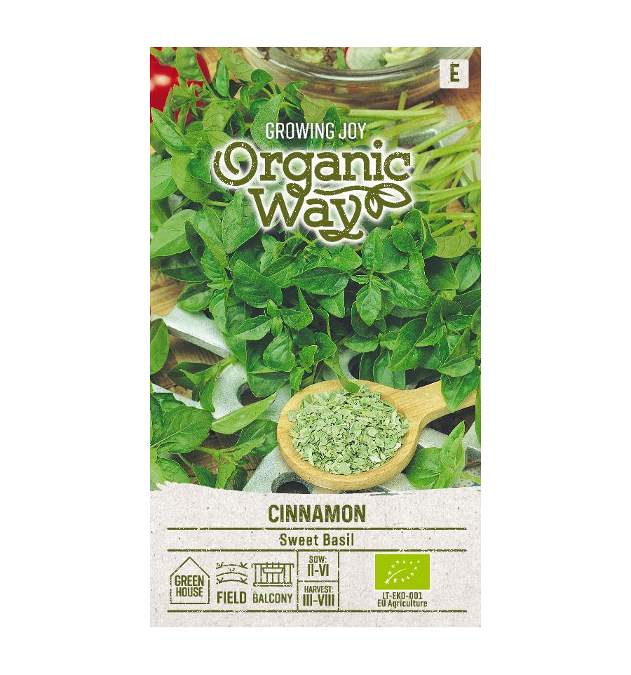 Luomusertifioitu makea, kanelibasilika. Pakkauskoko 0,5 g (1 g vastaa karkeasti 600-800 siementä)