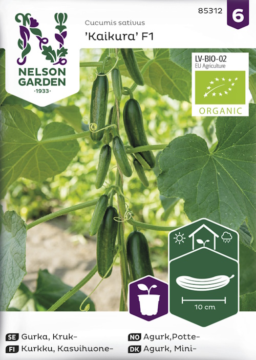 Luomulaatuinen siemen. Kaikura F1 on maukas ja rapea sileäkuorinen minikurkku, sopii erinomaisesti kasvihuoneeseen, suureen ruukkuun suojaisaan paikkaan tai ”kurkkuverhoksi” ikkunalle. Sido taimi. Latvo sopivan korkuisena. Ei kaipaa pölytystä, itsepölyttävä hybridilajike tuottaa tasaista ja runsasta satoa koko kasvukaudne ajan. Korjaa satoa usein, älä anna kurkkujen kasvaa liian suuriksi.