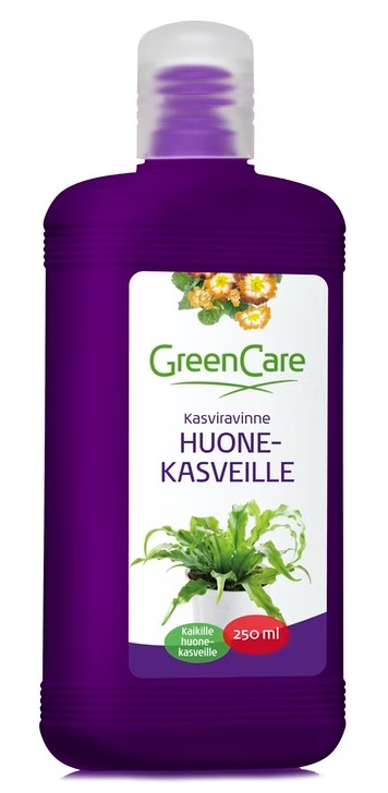 Kasviravinne huonekasveille GreenCare 250 ml. Nestemäinen ravinneliuos kaikille huonekasveille. Sisältää kaikki kasvin tarvitsemat ravinteet. Vaikutus näkyy muutamassa tunnissa. H