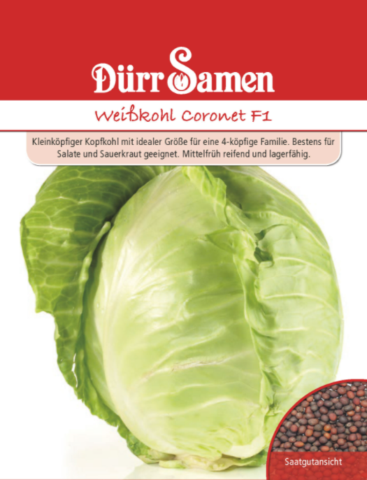 Keräkaali Coronet F1. Keskiaikainen, kooltaan sopiva esimerkiksi nelihenkiselle perheelle. Erinomainen salaatteihin ja myös hapankaaliksi. Kylvetään maalis-huhtikuussa, siemen itää voin 7 vuorokaudessa 12 asteessa. Taimiväli avomaalla 40 x 50 cm. Annoksessa noin 50 siementä.