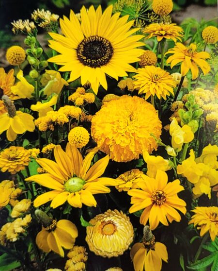 Tämä sekoitus sisältää keltaisen sävyisiä useita helposti kukkivia lajeja, kuten kehäkukka, unikkoa, käpykukkia, huopakukkia, zinniaa, auringonkukkia ja muita. Yksivuotinen. 30-80 cm.