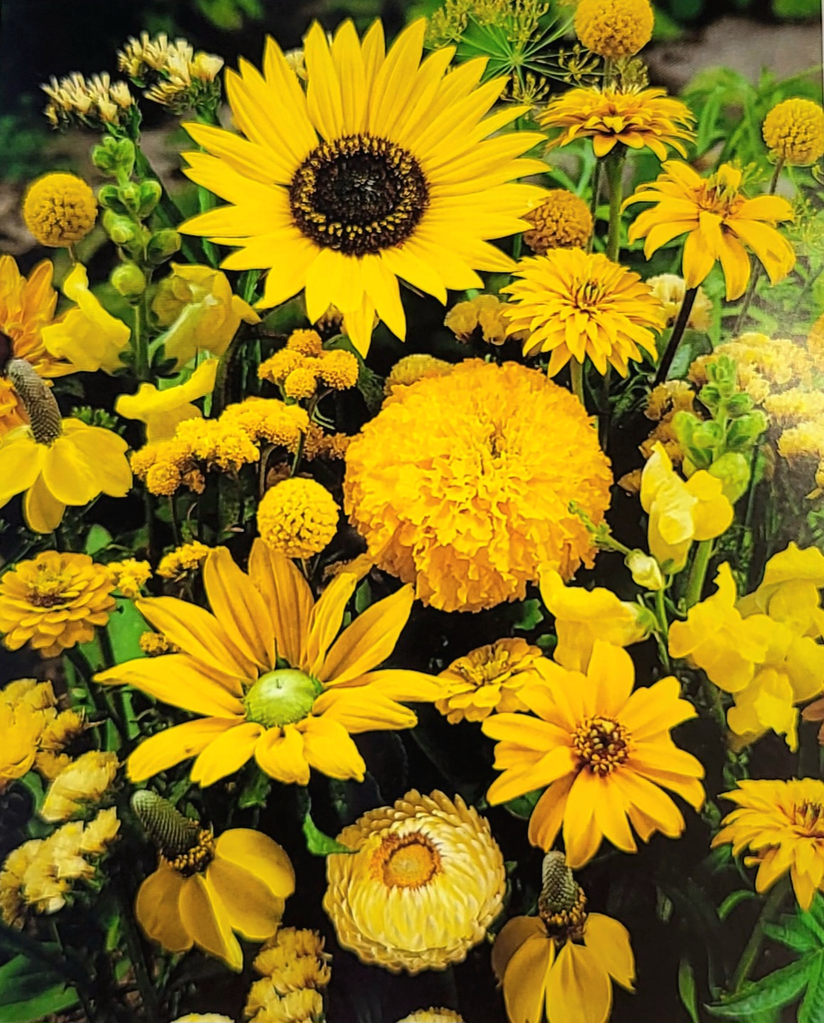 Yksivuotinen sekoitus keltaisen sävyisiä kukkia.