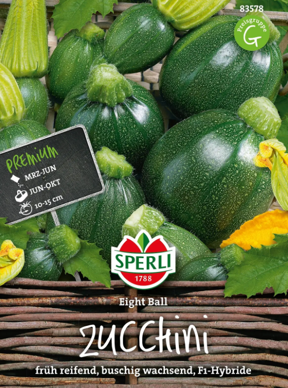 Kesäkurpitsa Eight Ball F1.Tummanvihreä, pyöreähedelmäinen F1-hybridi. Kasvu on tuuheaa ja sen hedelmät kypsyvät aikaisin. Hedelmät ovat parhaimmillaan kun ne ovat halkaisijaltaan n. 10-15 cm. Annoksesta tulee noin 7-8 kasvia.