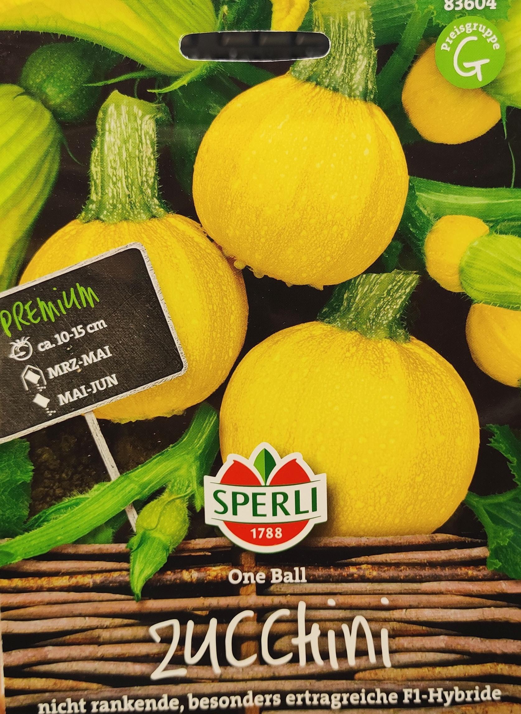 Kesäkurpitsa One Ball F1. Aikainen, hedelmät kooltaan n. 7-10 cm halkaisijaltaan. Hedelmät kerätään ”nuorina”. Kylvetään touko-kesäkuussa, siemen itää 8-14 vuorokaudessa 20-25 asteessa. Sadonkorjuu heinä-lokakuussa. Annoksesta tulee noin 5 kasvia.