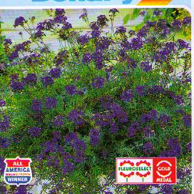Komeaverbena Imagination. Korkeus 30 cm.Kukinto 50 cm leveä. Sopii amppeleihin ja parvekkeelle. Kylvetään helmi-maaliskuussa, itää 20-30 vuorokaudessa 18-20 asteessa. Kukinta kesä-syyskuussa. Määrä 250 s.