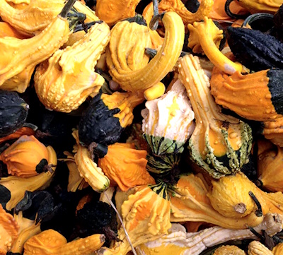 Sekoitus eri värisiä koristekurpitsoita. Kuva on suuntaa antava.
