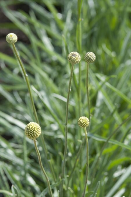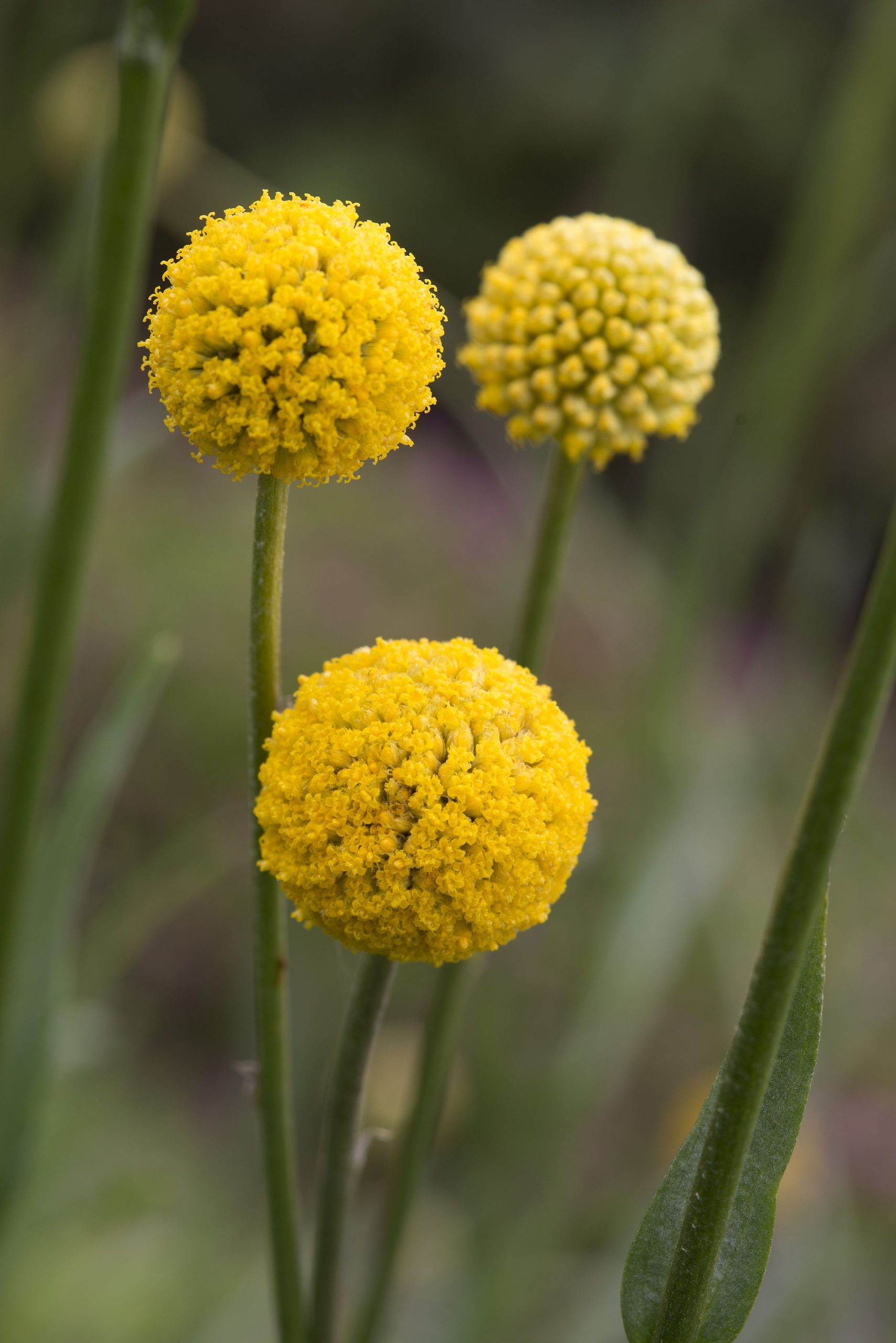 Craspedia globosa. Kultahehku Drumstick. Pallonpyöreät kullankeltaiset kukat ovat pitkissä, jäykissä varsissa. Erittäin hyvä, erikoinen laji kuivattavaksi.