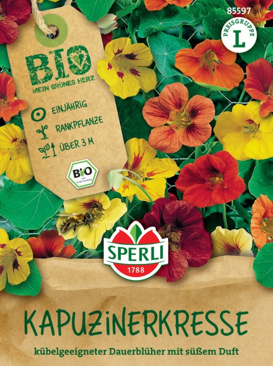 Luomu Isoköynnöskrassi sekoitus. Lumoavan hyvältä tuoksuva kasvi. Kukkii pitkään. Köynnöstävä kasvutapa. Kukat ovat syötäviä, mausteinen maku. Houkuttelee tehokkaasi pölyttäjiä. Luomusiemen.