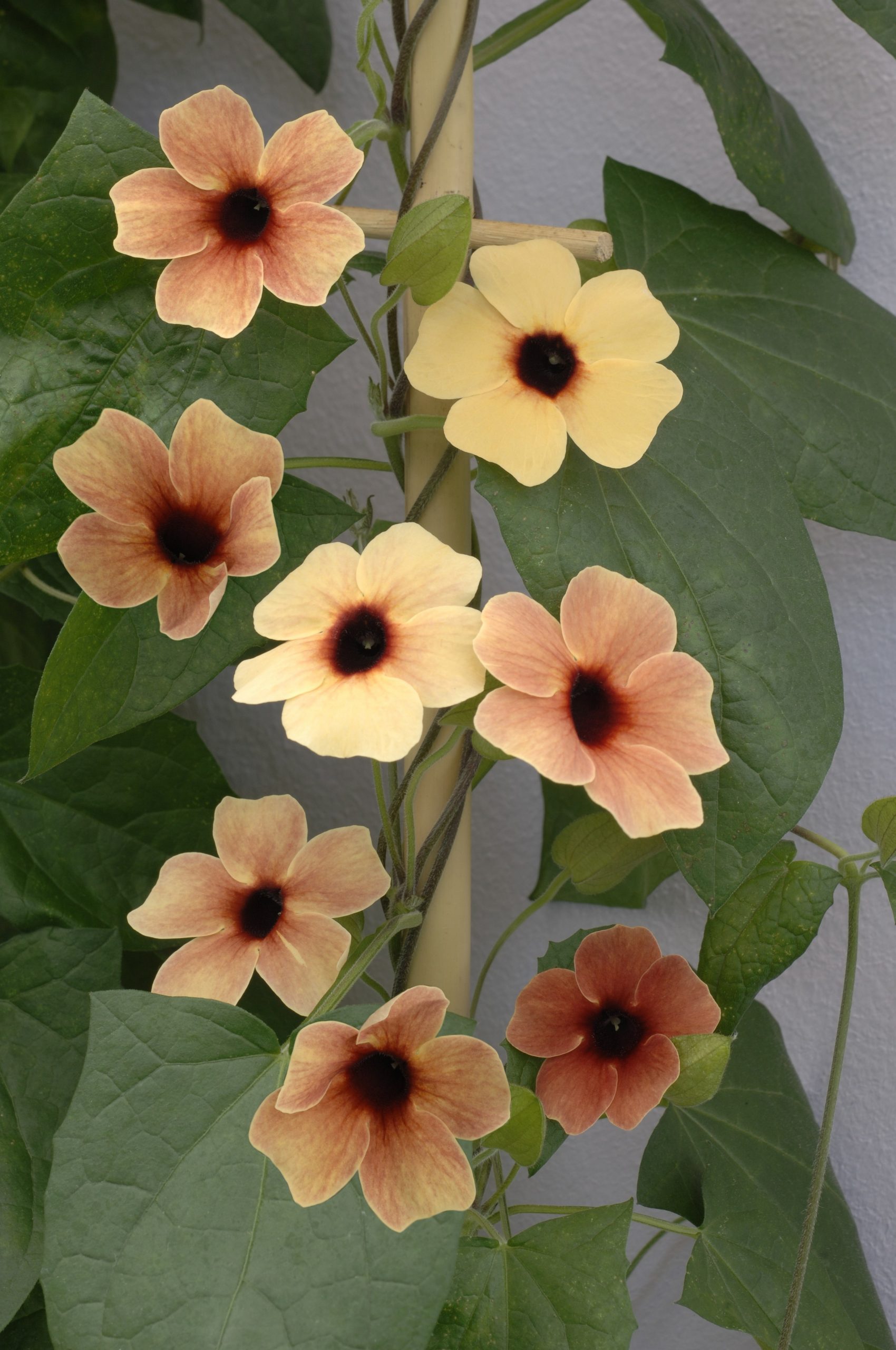 Mustasilmäsusanna African Sunset. Sekoitus, korkeus 80 cm. Kaunis amppeli- ja parvekekasvi.