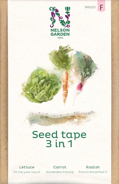 Pidä kylvös kosteana, niin itämisaika on noin 2-4 viikkoa. Tässä seoksessa kylvönauha on täynnänsä keräsalaattia ’All the year round’, retiisiä ’French Breakfast’ ja porkkanaa ’Amsterdam Forcing’.