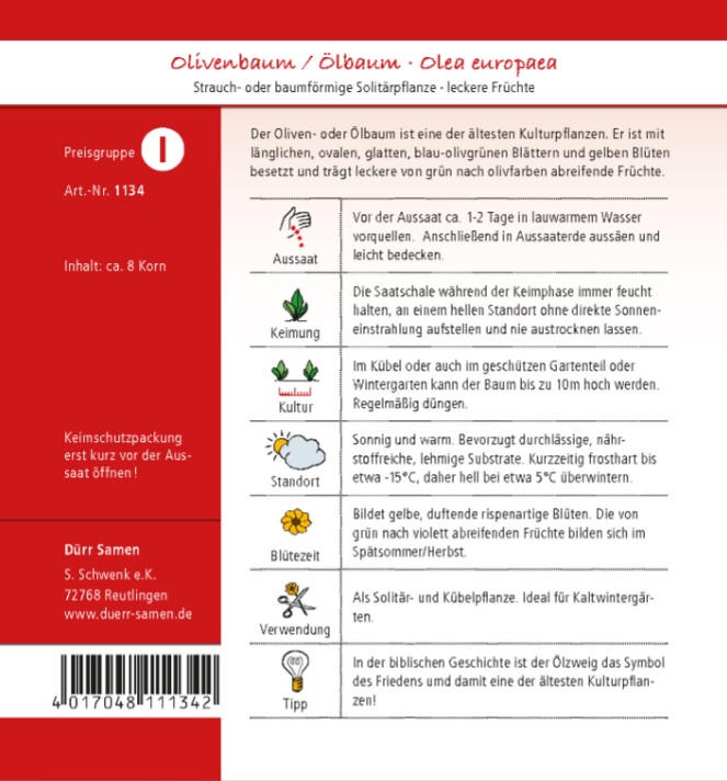 Oliivipuu. Monivuotinen ruukkukasvi. Kylvö mahdollista ympäri vuoden.