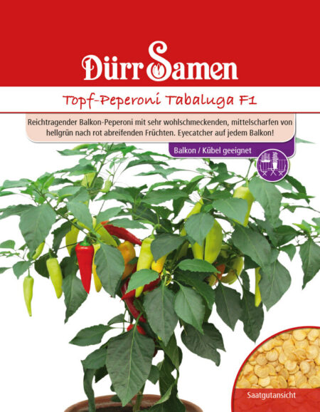 Paprika-peperoni Tabaluga F1. Kylvetään helmi-huhtikuussa, siemen peitetään kevyesti, itää valossa 8-10 vuorokaudessa 22-24 asteessa. Kasvupaikka aurinkoinen ja lämmin. Satoa saadaan heinä-lokakuussa. Annoksessa noin 8 siementä.
