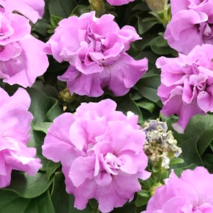Petunia multiflora Duo Lavender. Kerrottu. Amppeleihin, ruukkuihin, parvekelaatikoihin. Viihtyy auringossa ja puolivarjossa. Kylvetään helmi-huhtikuussa, siemen itää valossa 10-20 vuorokaudessa 18-22 asteessa. Kukinta kesä-lokakuussa.