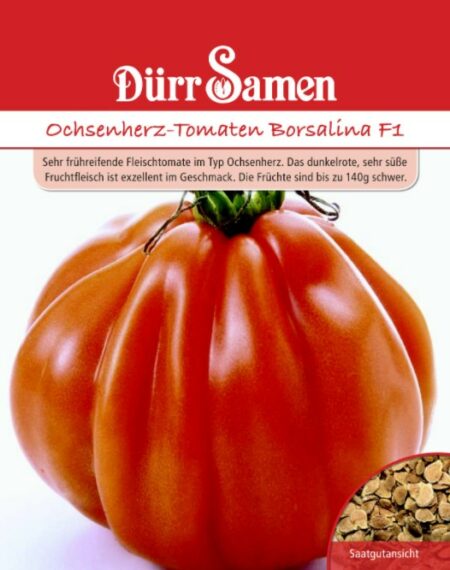 Pihvitomaatti Borsalina F1. Hedelmät tummanpunaiset, Aikainen, hedelmäliha erittäin makea. Hedelmät kooltaan jopa 140 g. Pussissa noin 8 siementä.’Häränsydäntomaatti’