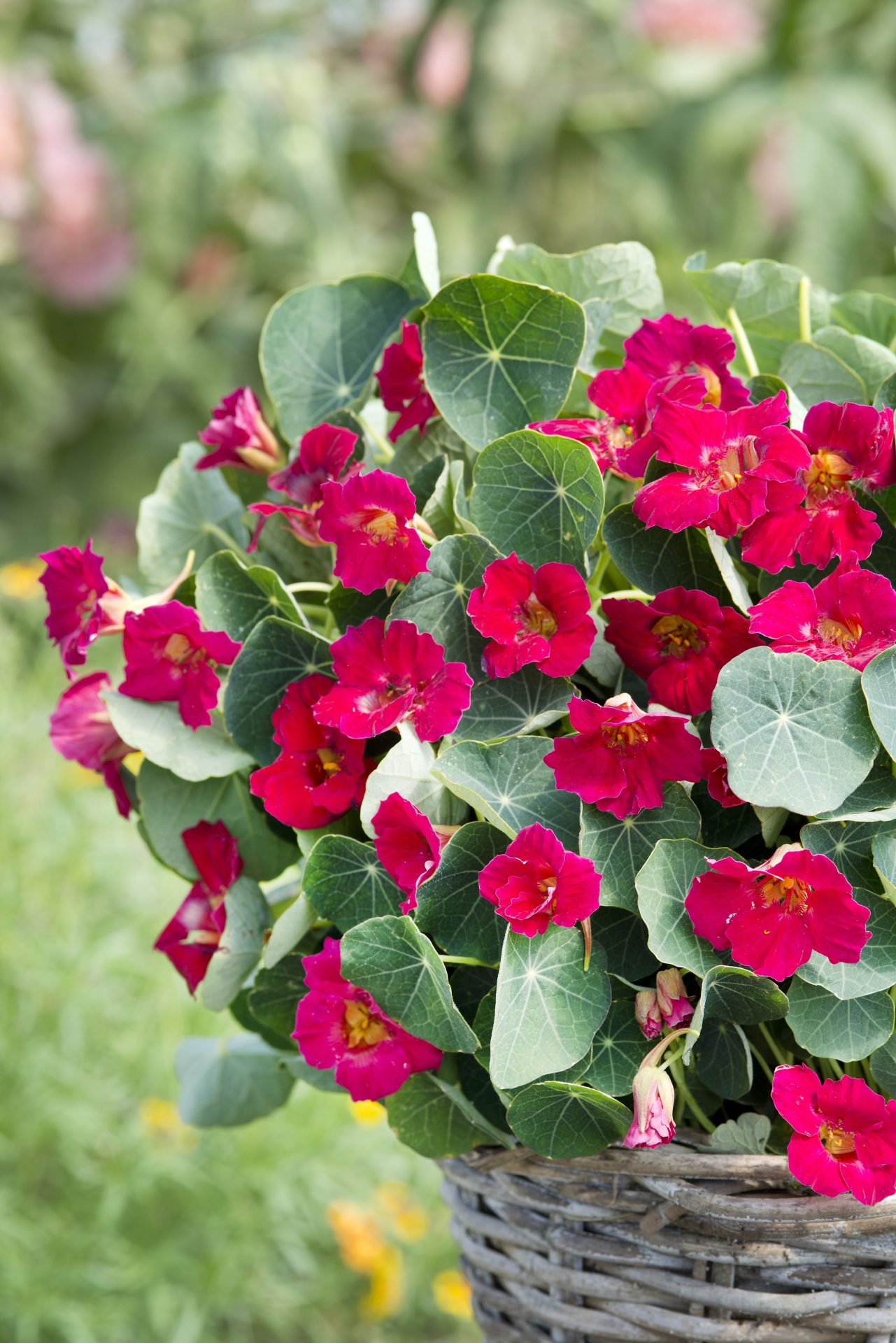 Tropaeolum minus. Pikkuköynnöskrassi Baby Rose 50 g. Todellinen katseenvangitsija puutarhassa. Kirkkaan ruusunpunaiset kukat.