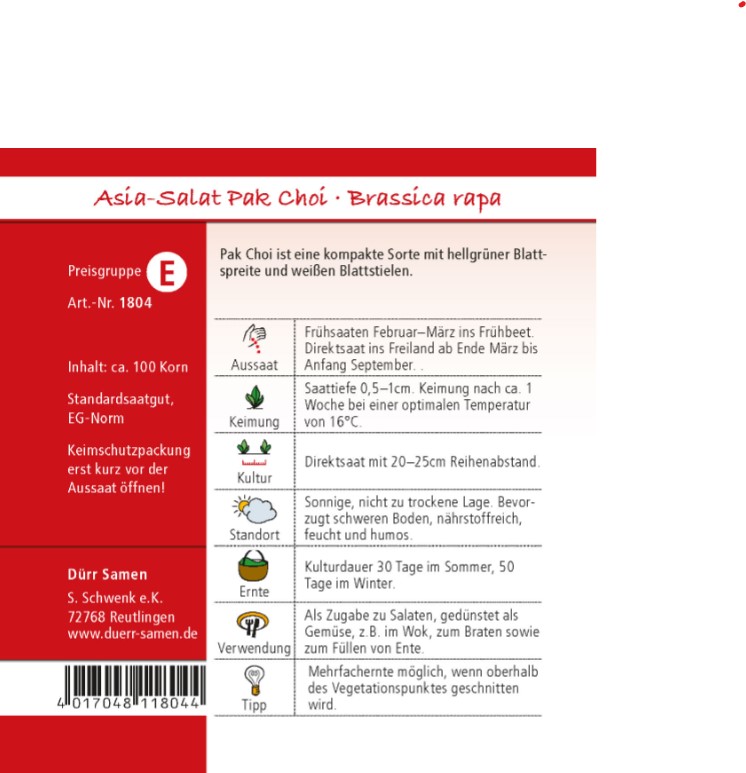Pinaattikiinankaali Pak Choi. Hyvänlaatuinen, herkullinen. Lehtien alaosa on mehevä ja valkoinen, yläosa vaaleanvihreä. Kylvetään huhti-kesäkuussa, siemen itää 7 vuorokaudessa 16 asteessa. Satoa saadaan 30-50 vuorokauden kuluttua. Sopii hyvin wok-ruokiin, mutta voidaan käyttää myös pinaatin tavoin. Annoksessa noin 100 siementä.