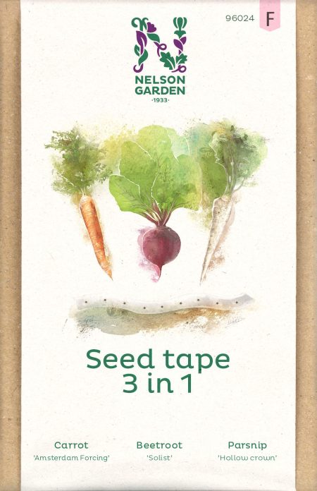 Kolmen kylvönauhan upea seos kolmesta juureksesta. Täytä lavakaulukset ja kasvimaa herkullisella porkkanalla ’Amsterdam Forcing’, punajuurella ’Solist’ ja palsternakalla ’Hollow Crown’. Kylvönauhan ansiosta viljeleminen on helppoa. Repäise sopivan pituinen pala kylvönauhaa ja aseta se kylvövakoon. Kastele huolellisesti ennen kuin peität nauhan sentin paksuisella multakerroksella. Tarkista, että nauhan päät eivät ole näkyvillä (muuten linnut saattavat tarttua niihin). Jos peität katekankaalla, itämisaika lyhenee ja on noin 2-4 viikkoa. Kylvöala on tärkeää pitää kosteana.