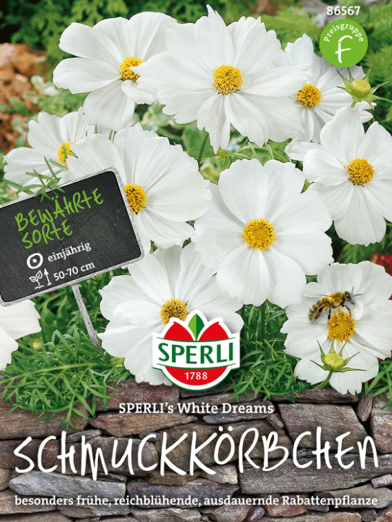 Punakosmoskukka Sperli’s White Dreams. Matala 50-70 cm. Valkoinen. Kylvetään huhti-kesäkuussa, itää 10-20 vuorokaudessa 15-20 asteessa. Viihtyy aurinkoisella kasvupaikalla. Kukinta heinä-syyskuussa. Annos noin 30 tainta.