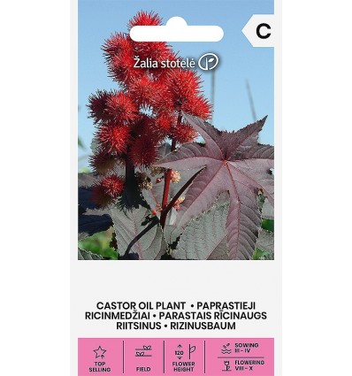 Punaiset kukat, lehdet tummanruskeat. Korkeus 150cm. Kylvetään helmi-maaliskuussa, siemeniä liotetaan ennen kylvöä 24 tuntia. Itää 14-21 vuorokaudessa 15-18 asteessa. Viihtyy aurinkoisella kasvupaikalla. Kukinta elo-lokakuussa. Määrä 5 siementä. SIEMEN MYRKYLLINEN, koko kasvi on myrkyllinen, mutta erityisesti siemen. Valmispussin ulkonäkö vaihtelee saatavuuden ja erän mukaan, sama sisältö, kasvi 5 s. Myrkyllinen.