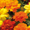 Tagetes patula nana. Alumia-ryhmä tuottaa suuria kukintoja ja vahvat haarautuvat varret.