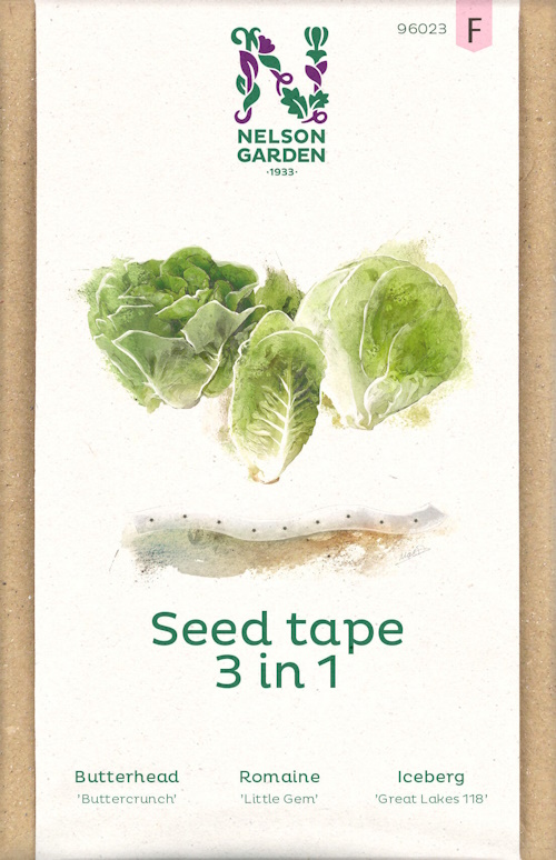 Kolmen kylvönauhan runsas seos kolmesta salaattilajikkeesta. Kasvimaassa pääosaa näyttelevät nyt keräsalaatti ’Buttercrunch’, jäävuorisalaatti ’Great Lakes’ ja sidesalaatti ’Little Gem’. Repäise sopivan pituinen pala kylvönauhaa ja aseta se kylvövakoon. Kastele huolellisesti ennen kuin peität nauhan sentin paksuisella multakerroksella. Tarkista, että nauhan päät eivät ole näkyvillä (muuten linnut saattavat tarttua niihin). Jos peität katekankaalla, itämisaika lyhenee ja on noin 2-4 viikkoa. Kylvöala on tärkeää pitää kosteana.