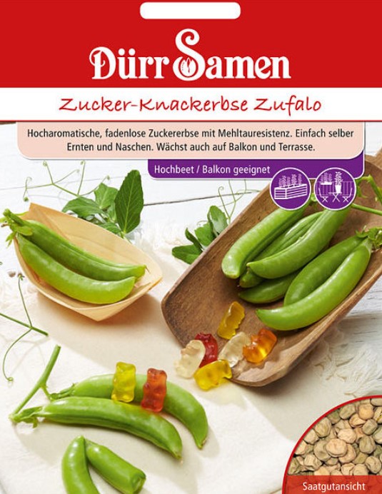 Sokeriherne Zufalo. ”Sugar snap pea” on erittäin makea, säikeetön ja härmänkestävä sokerihernelajike. Sopii hyvin kasvatettavaksi myös ruukuissa esim. terassilla ja parvekkeella. Kylvö huhtikuusta alkaen mahdollisimman aikaisin, viimeistään toukokuun lopussa. Kylvösyvyys 3-4 cm. Annoksessa n. 150 siementä.