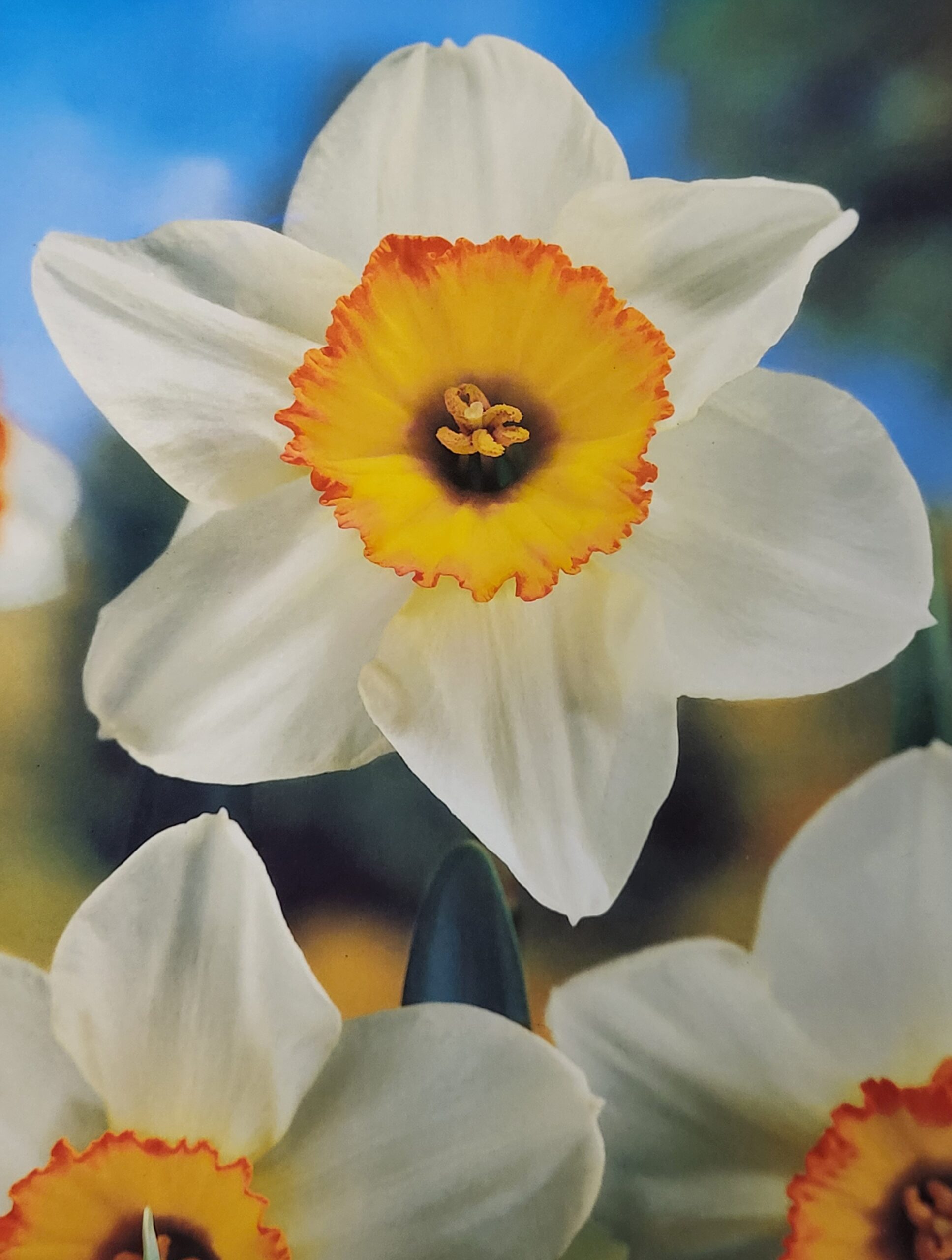 Valkoinen, oranssi kuppi. Korkeus 40 cm. Keskiaikainen. Sipulin koko 14/16. Narsissit ovat monivuotisia. Jokainen sipuli kukkii useana vuotena muodostaen samalla sivusipuleita. Kukinta-aika huhti-toukokuu. Narsissit kannattaa istuttaa mahdollisimman aikaisin ( syyskuu- lokakuun puoliväli), että ne ehtivät juurtua kunnolla. Narsisseista tulee komeimpia paikoissa, joissa maa on keväällä kosteaa, mutta kuivuu myöhemmin. Istutussyvyys on suurisipulisilla lajikkeilla vähintään 15 cm, pienillä vähintään 5 cm. Narsissit kukkivat auringossa, mutta viihtyvät parhaiten puolivarjossa. Annetaan olla rauhassa kunnes kukinta heikkenee, tällöin sipulit nostetaan maasta, jaetaan ja istutetaan uudelleen harvempaan.