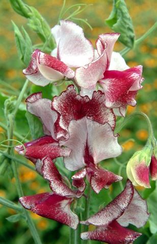 Tuoksuherne, väri ”mars” valkoisen ja punaisen sekoitus, kukkii hieman myöhemmin kuin muut lajikkeet. Yksivuotinen koristekasvi aurinkoiselle paikalle.