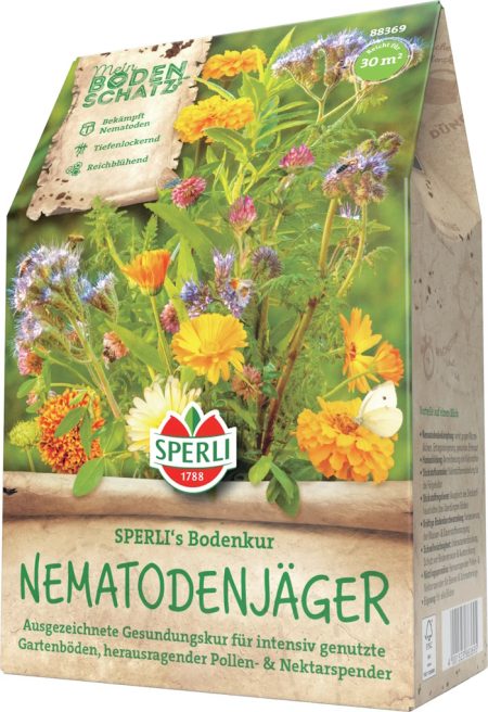 Sperlin maanparannus, viherlannoitus, ja pölyttäjäseos ’Nematodenjäger Bodenkur’, riittää 30 m2 alueelle. Paino 100 g netto. Lisää maaperään elinvoimaa ja houkuttelee pölyttäjiä.