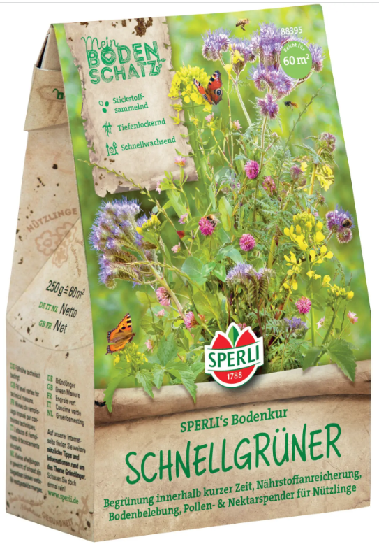 Viherlannoitussekoitus Sperli 250 g. SPERLIN ’Schnellgrüner’ on yksivuotinen vihantalannoitus seos. Sisältää apilaa, aitohunajakukka, keltasinappia ja raiheinää. Varjostaa maaperää, vähentää villiyrttien esiintymistä ja suojaa maaperää kuivumiselta, liettymiseltä ja ravinteiden huuhtoutumiselta. Syvälle ulottuva juuristo auttaa löysäämään maata ja siten parantamaan maan rakennetta. Houkuttelee tehokkaasti myös pölyttäjiä.